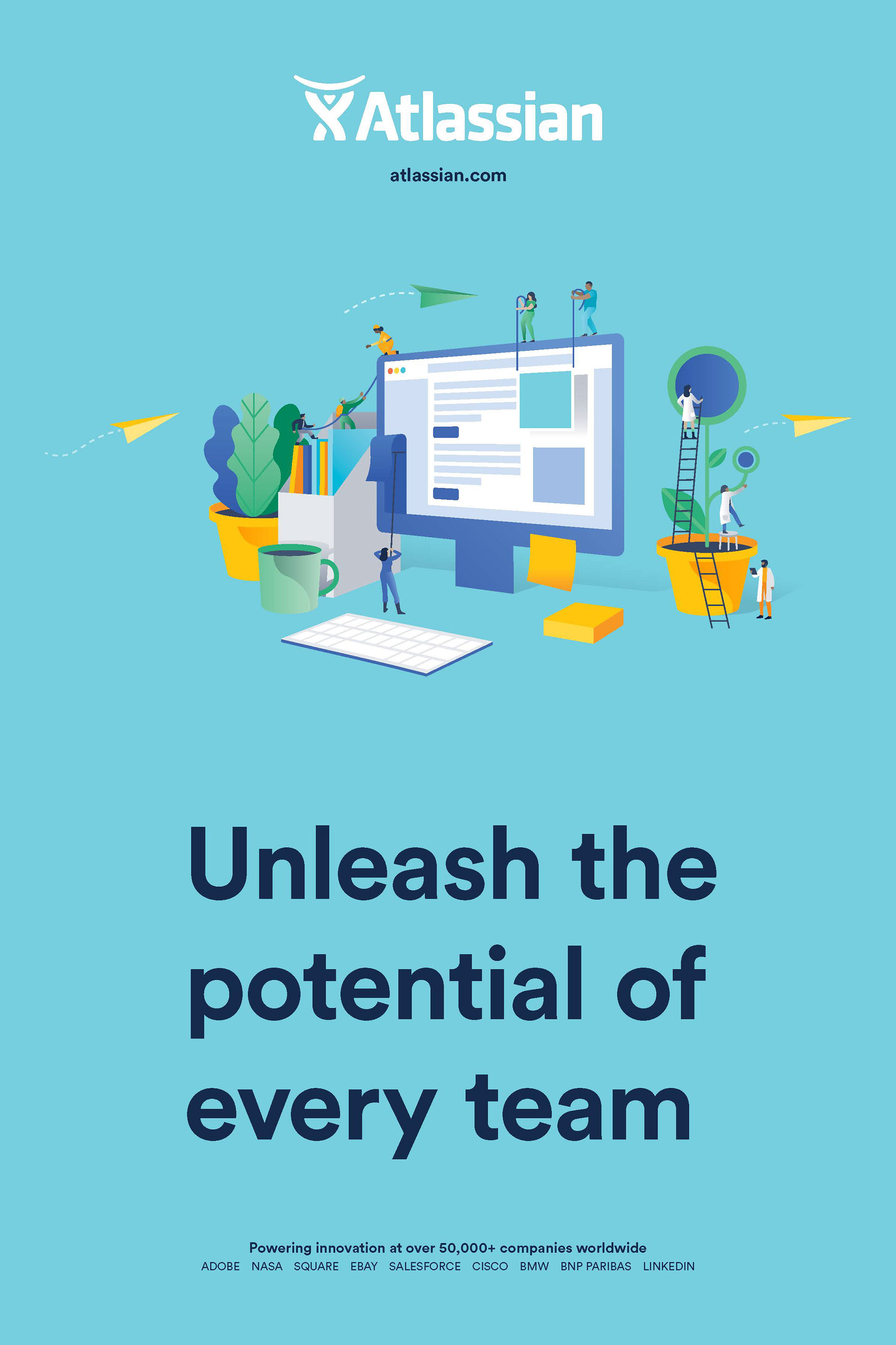 Industry events are a key touch point for the software company Atlassian and its customers. I was tasked with creating collateral that could be used as both a "take-away package" at an industry event as well as used for display at the event booth. I designed a series of posters with the message "Unleashing the potential of every team", that could wrap around a set of postcards that detailed the benefits of several of Atlassian's key product solutions.