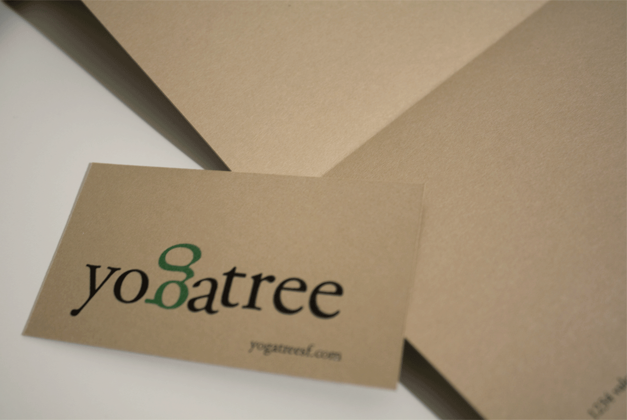 Word Mark for a Bay Area Yoga Studio The 'g' in this logo is doing a salamb-sisrsasana or the famous upside-down yoga pose. The secondary type is not perfectly aligned but shifts on the base line to suggest fluidity. The playfulness of the design is carried through to the back of the letterhead where the upside down letters forms a pattern. It was printed on stock from Paper Source, which partners with mills that adhere to strict environmental and socioeconomic standards.